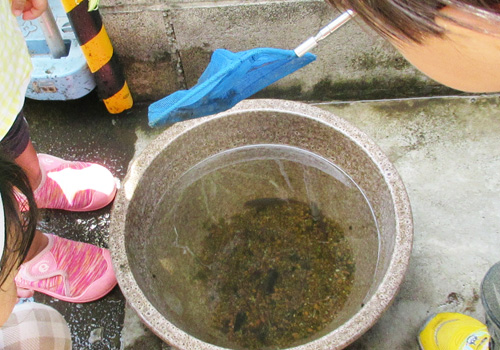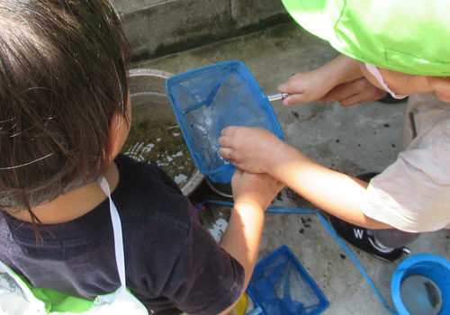 急きょの引っ越し騒ぎに。水を減らしても網で掬えるももではなく、保育士ドロドロの手でつかまえるももちろんぬるぬるでコンクリートに、また、これを捕まえるのも網やプラケースと大騒ぎ