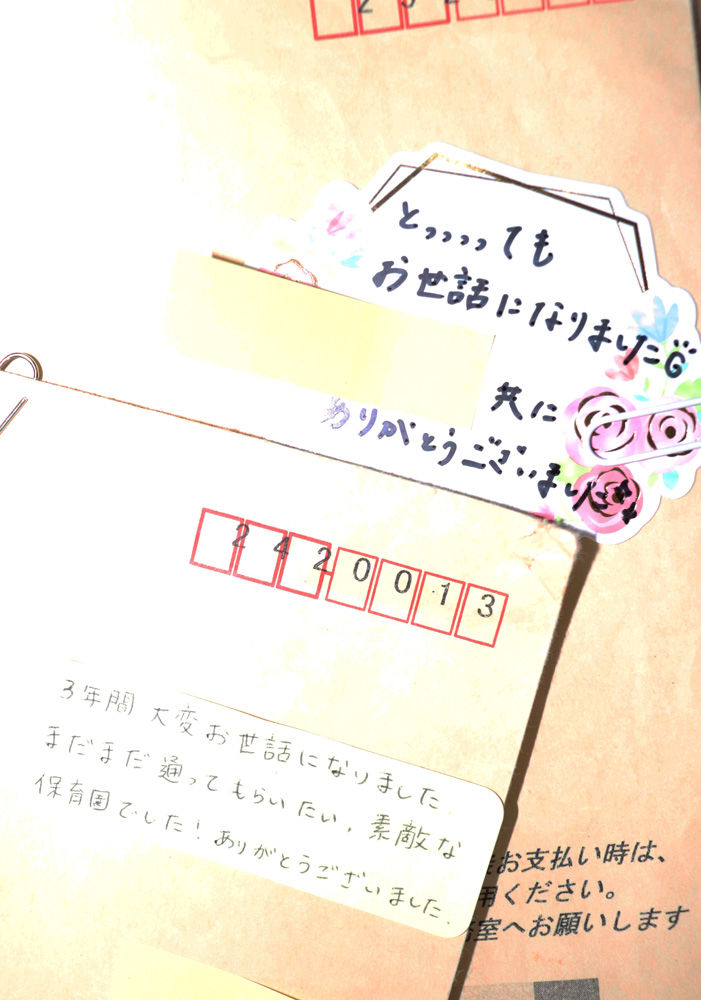 保育ルームハミング(2階)のお話です。先日、卒園児へは最後の保育料の請求をした。毎月、請求書を封筒に入れており、口座振替(キャッシュレス)の方で支払い後その封筒をまた使ってくださいとのことで、毎月その封筒を支払い後、月謝袋のように返却してくれていた。(ありがたいかぎりです)それが、3年間続き、ついに最後請求となった。「3年間ありがとうございました」と付箋を張ったところその封筒に