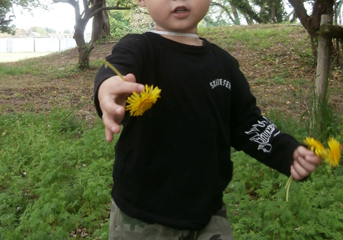跳んだカエルを・・・遠目に眺める子も、でもカエルがいたよとはっきりと教えてくれました。広場は、たくさんのたんぽぽのじゅうたん
